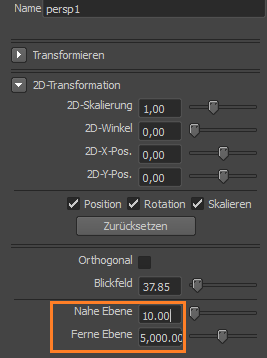Wenn Sie Kameraattribute, z. B. Nahe Zuschneideebene und Ferne Zuschneideebene in Maya, ändern, werden die entsprechenden Attribute (Nahe Ebene und Ferne Ebene) in Mudbox genau mit den gleichen Werten aktualisiert.