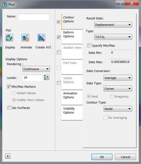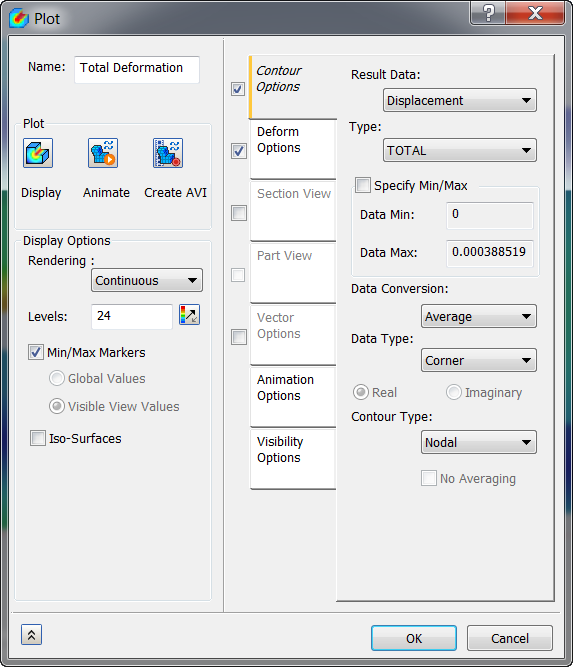 - Im Abschnitt Konturen – Optionen können Sie festlegen, welche Ergebnisdaten angezeigt werden sollen. Wenn Sie das Kontrollkästchen Min/Max festlegen aktivieren, können Sie die Werte für Daten Max. und Daten Min. anpassen und so den Konturplot ändern.