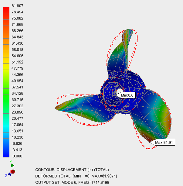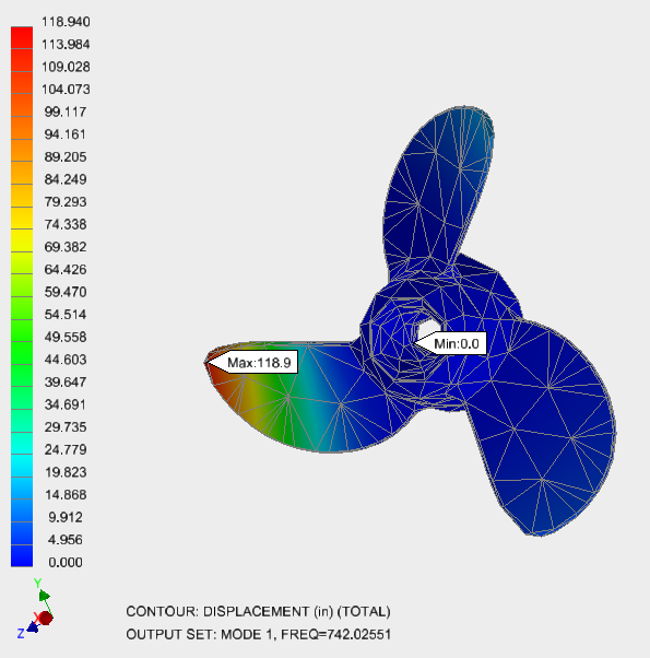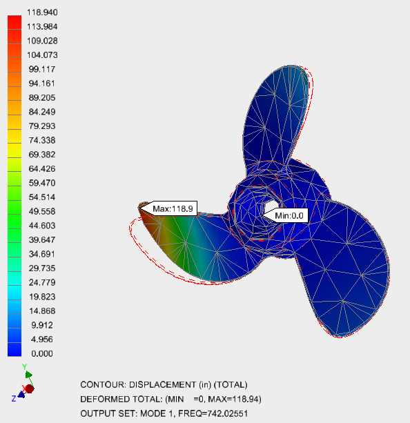 Im ersten Modus biegen sich die Propellerblätter aus der Ebene der unverformten Blätter heraus und zeigen eine Biegemodusform.