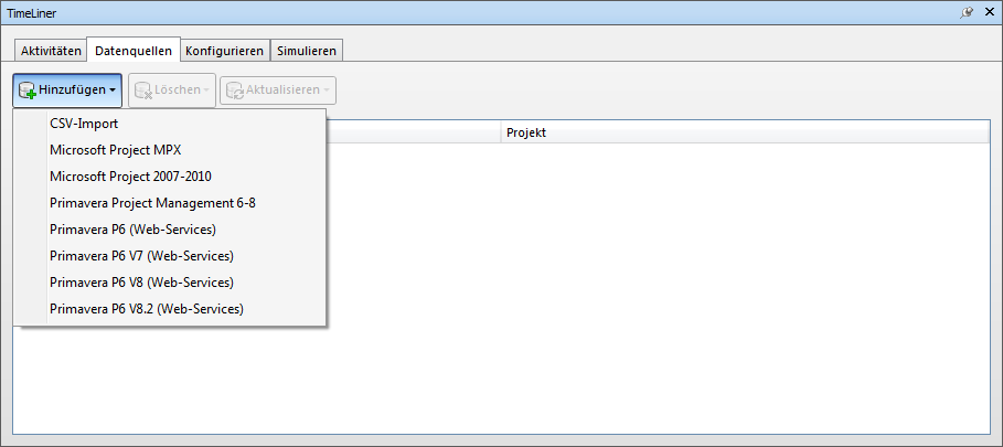 Anmerkung: Autodesk Navisworks TimeLiner unterstützt Datenquellen anderer Hersteller mithilfe der Autodesk Navisworks-.NET-API und bietet Windows 8-Unterstützung für MS Project-, CSV- und Primavera-Formate. Die Unterstützung für eine neue Datenquelle kann von den Benutzern selbst entwickelt werden. Weitere Informationen finden Sie in der API-Dokumentation.