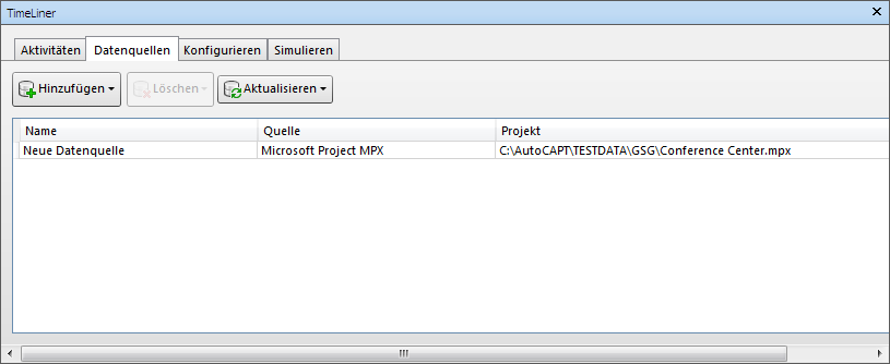 Mithilfe der Registerkarte Datenquellen können Sie Aktivitäten aus der Planungssoftware eines Drittanbieters importieren, beispielsweise aus Microsoft Projekt, Asta oder Primavera. Sie zeigt alle hinzugefügten Datenquellen in Tabellenform an.