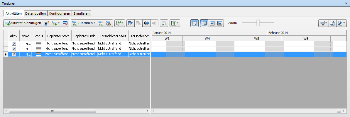Aktivitäten können der aktuellen Auswahl in der Szenenansicht, einem beliebigen Auswahlsatz oder einer beliebigen Suchgruppe zugeordnet werden. Sie können Elemente aus der Szenenansicht, dem Fenster Gruppen und der Auswahlstruktur ziehen und direkt auf einer Aktivität ablegen. Sie können den Zuordnungstyp in der Spalte Zugeordnet anzeigen. Standardmäßig befindet sich diese Spalte hinter Aktivitätstyp. Sie können sie aber verschieben, beispielsweise vor die Spalte Start.