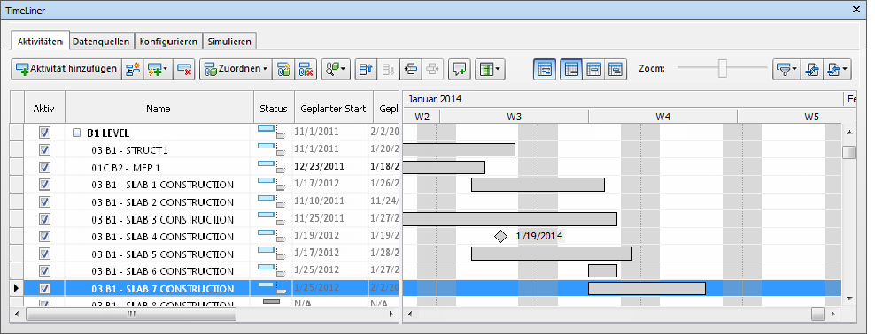 Autodesk Navisworks TimeLiner unterstützt hierarchische Aktivitätsstrukturen, die aus einer Datenquelle importiert wurden, zum Beispiel Microsoft Project™ (weitere Informationen finden Sie unter Registerkarte Datenquellen). Die Hierarchie kann erweitert oder reduziert werden, indem Sie auf das Plus- bzw. Minuszeichen links von der Aktivität klicken.