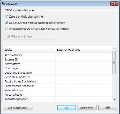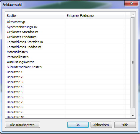 Das Dialogfeld Feldauswahl zum Importieren von Daten aus einer externen Planungssoftware