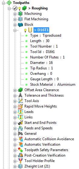 Erweitern Sie ein Werkzeugwegelement im Explorer, um weitere Informationen zu den Parametern anzuzeigen, mit denen es erstellt wurde.
