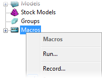 Aufzeichnen — Klicken Sie, um den Datei für Makroaufzeichnung wählen-Dialog zu öffnen. Bewegen Sie sich zum korrekten Verzeichnis, geben Sie einen geeigneten Namen für das Makro in das Dateiname-Feld ein und klicken Sie auf Speichern. Von nun an (bis Sie Makro > Stopp) wählen) werden alle Befehle, die Sie in PowerMill ausführen, in der Makrodatei gespeichert.