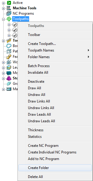 Ordner erstellen – Wählen Sie dies, um einen Ordner mit der Bezeichnung Ordner1 zu erstellen. Sie können diesen Ordner ganz normal umbenennen und Elemente eines bestimmten Typs in den Ordner ziehen und ablegen (z. B. Werkzeugwege in einen Werkzeugwegordner).