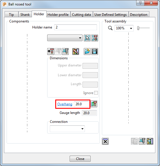 - Geben Sie einen Auskragungs-Wert ein, der der Halterlänge entspricht. Dieser definiert die Länge des Werkzeugs, die über den Messpunkt der Maschine herausragt. Klicken Sie dann auf die Schaltfläche Schließen. Dadurch wird das Werkzeug und die Auskragung angezeigt.