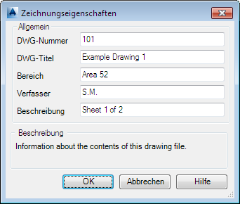 Im Dialogfeld Zeichnungseigenschaften werden die hinzugefügten Eigenschaften angezeigt. Verwenden Sie bei Bedarf die Bildlaufleiste, um die Eigenschaften einzublenden.