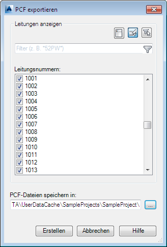 Wählt Leitungen aus, die in eine exportierte Rohrleitungskomponenten-Datei (Piping Component File, PCF) aufgenommen werden sollen.