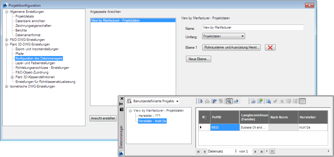 Sie können auch benutzerdefinierte Ansichten Ihrer Plant-Objektdaten erstellen, sodass eine beliebige Eigenschaft hervorgehoben wird. In diesem Beispiel ist die Eigenschaft Hersteller so festgelegt, dass sie auf oberster Ebene in der Strukturansicht des Datenmanagers angezeigt wird. Sie können Eigenschaften auch auf verschiedenen Ebenen verschachteln, um die Ansicht zu verfeinern.