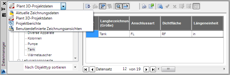 Im Datenmanager stehen verschiedene Möglichkeiten zum Anzeigen Ihrer Daten zur Verfügung: nach Projekt, nach Zeichnung oder nach integrierten Berichten.