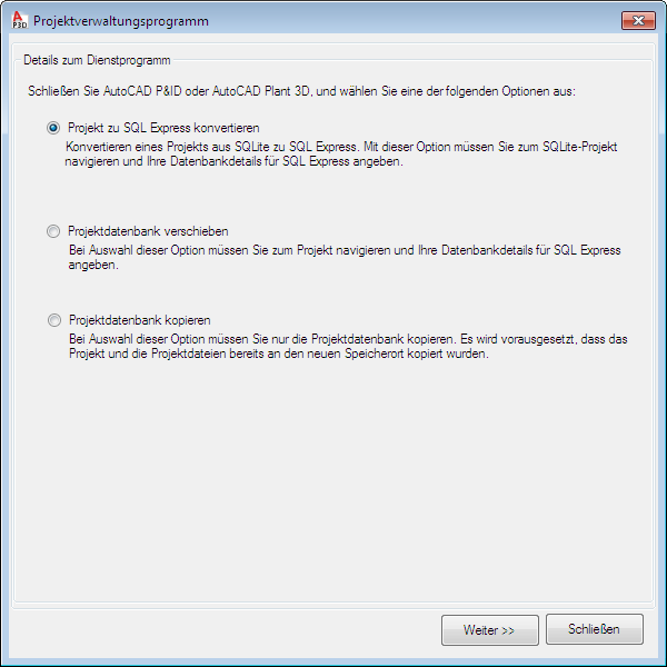 Klicken Sie auf Weiter, um das Dialogfeld Projektverwaltungsprogramm - Projekte zu SQL Express konvertieren anzuzeigen.