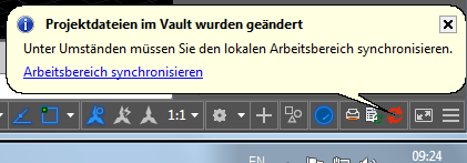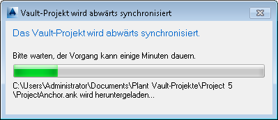 Im Arbeitsordner gesperrte Dateien können vom Vault aus nicht aktualisiert werden. Vor der Aktualisierung vom Vault aus können Sie den Projektmanager zum Schließen und erneuten Öffnen des Projekts verwenden. Beim Schließen des Projekts werden die Dateien, die während der Zeichensitzung verwendet wurden, entsperrt (z. B. Rohrklassen-Dateien, die beim Verlegen von Rohren gesperrt sind).
