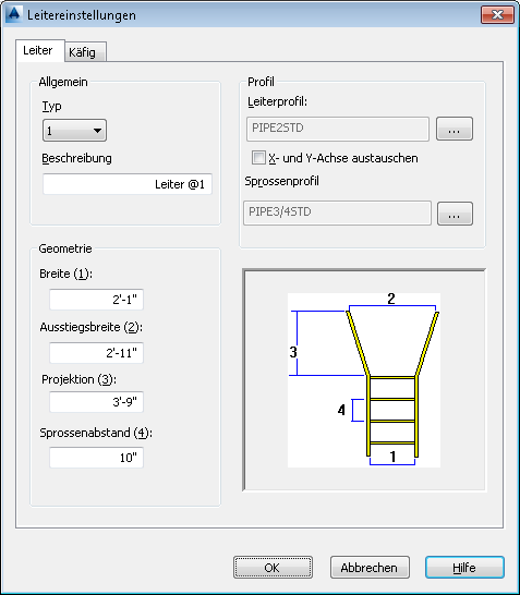 Legt die Geometrieeinstellungen für Leitern fest. In Klammern angegebene numerische Werte entsprechen der beschrifteten Geometrie im Vorschaubild.