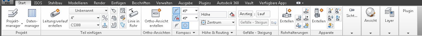 Die Registerkarte 3D-Rohrleitung - Start ist Teil des Arbeitsbereichs 3D-Rohrleitung.