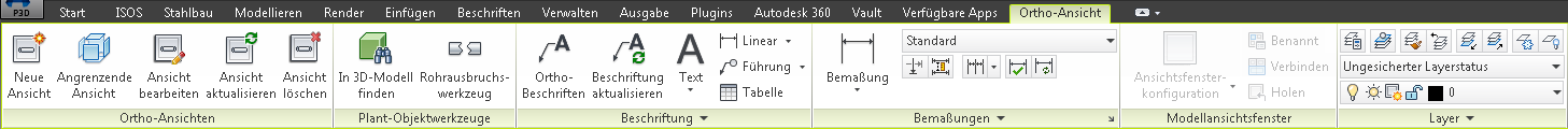 Die kontextabhängige Registerkarte Ortho-Ansicht ist Teil des 3D-Rohrleitung-Arbeitsbereichs.