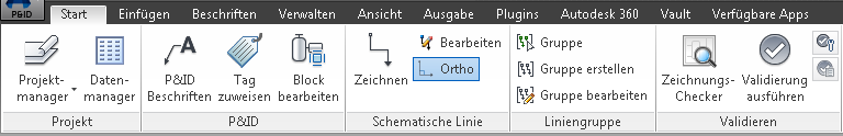 Die Registerkarte Start (P&ID) ist in den Arbeitsbereichen P&ID PIP, P&ID ISO, P&ID ISA, P&ID DIN und P&ID JIS/ISO enthalten.