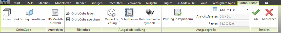 Die Registerkarte Ortho-Ansicht zeigt Optionen für das Arbeiten mit 2D-Ableitungen an. Die Registerkarte enthält die folgenden Gruppen: