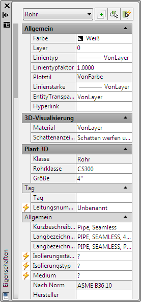 In der Eigenschaftenpalette können Sie die Daten eines Objekts ändern (beispielsweise die Rohrspezifikationen, einen Isoliertyp oder die Dicke, usw.). Über die Eigenschaftenpalette können Sie auch auf das Dialogfeld Bezeichnung zuweisen zugreifen, in dem Sie die Bezeichnungsinformationen ändern können.