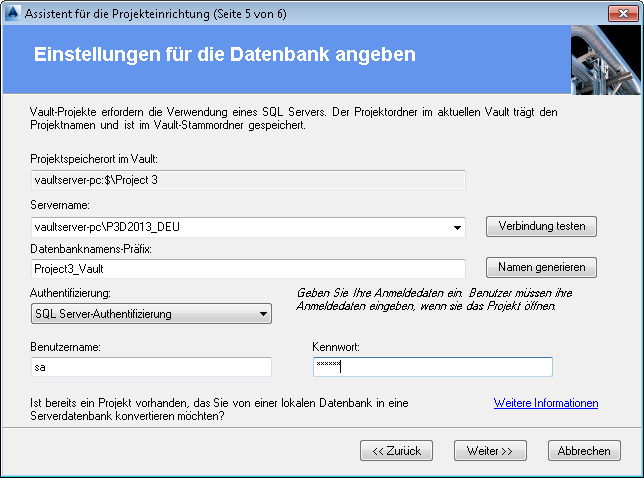 Verwenden Sie SQL Server für Vault-Projekte. Sie können den gleichen SQL Server verwenden, den Autodesk Vault verwendet, die Datenbank unterscheidet sich jedoch bei jedem Plant-Projekt.
