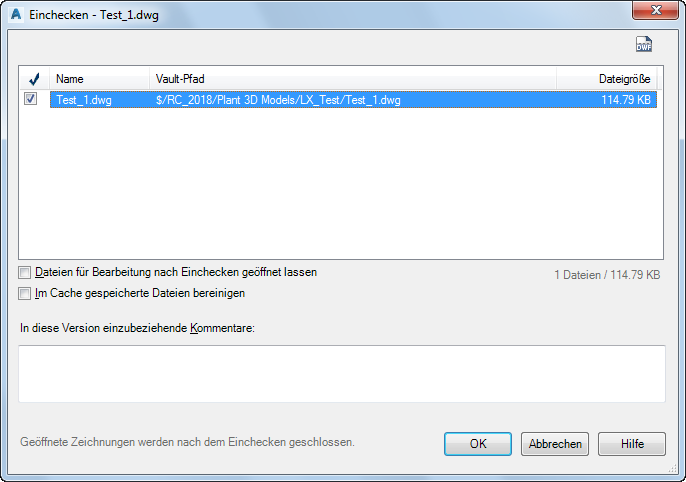 Der von Ihnen angegebene Zeichnungsname wird im Titel angezeigt. Wenn die Zeichnung auf andere Dateien verweist, werden auch deren Vault-Status angezeigt.