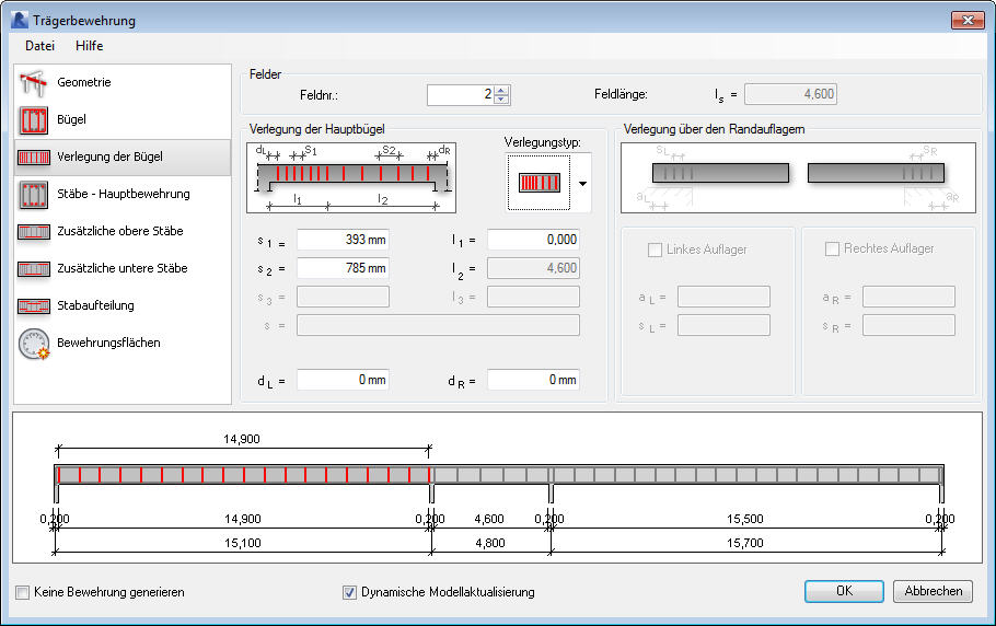 Die Zonen für die Bügelverlegung werden für jedes Feld separat definiert. Zu den Parametern für die Bügelverlegung entlang der Balkenlänge gehören: