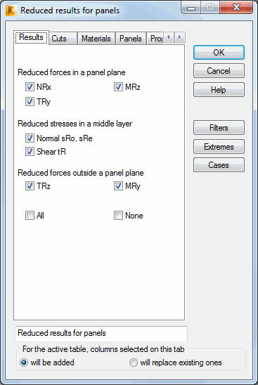 Select the Results tab in the Columns dialog to select quantities for presentation.