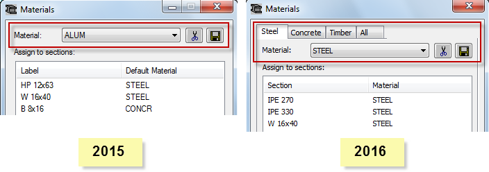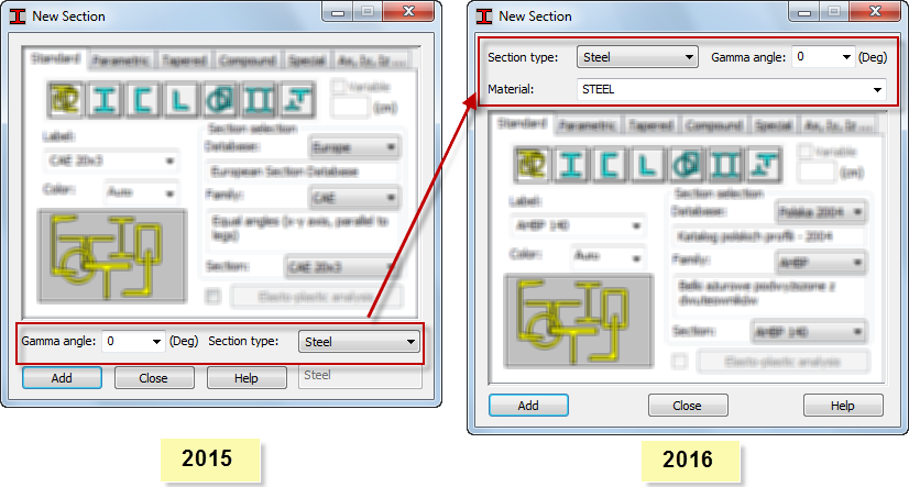 The main advantage of this new dialog arrangement is the possibility to select a material directly from the New Section dialog.