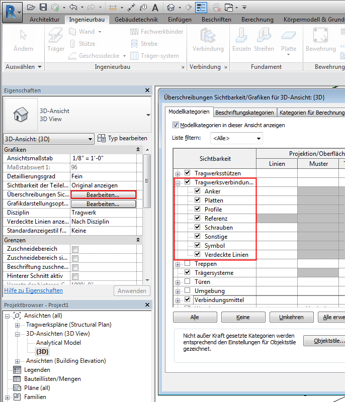 Die Sichtbarkeit von Stahlverbindungen in einer bestimmten Ansicht wird über das Menü Überschreibungen Sichtbarkeit/Grafiken gesteuert. Die Verbindungselemente werden in der Kategorie Tragwerksverbindungen platziert und in sechs Unterkategorien unterteilt: Anker, Schrauben, Bleche, Profile, Symbole und Sonstige.