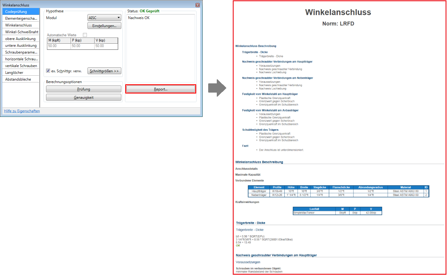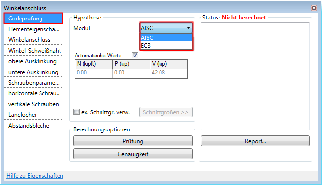 Mit den Optionen auf dieser Registerkarte können Sie den Entwurf der Tragwerksverbindung gemäß den Normen AISC oder EC3 überprüfen.