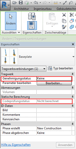 Bei allen Tragwerksverbindungen sind zwei integrierte Parameter vorhanden: Genehmigungsstatus und Codeprüfungsstatus. Diese werden in der Eigenschaftenpalette angezeigt. Der Codeprüfungsstatus wird automatisch von der Codeprüfungs-Engine ausgefüllt.