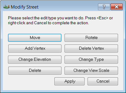 Die folgende Abbildung zeigt das Dialogfeld Modify Street (Straße ändern). Für manche Werkzeuge von Site Designer enthält das Dialogfeld Modify (Ändern) andere Optionen.