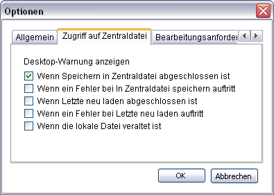 Aktivieren Sie die gewünschten Optionen, um festzulegen, dass Desktop-Warnungen zur Zentraldatei angezeigt werden sollen. Deaktivieren Sie die entsprechenden Optionen, wenn diese Desktop-Warnungen nicht angezeigt werden sollen.