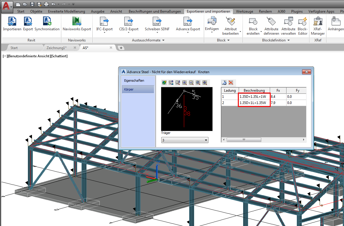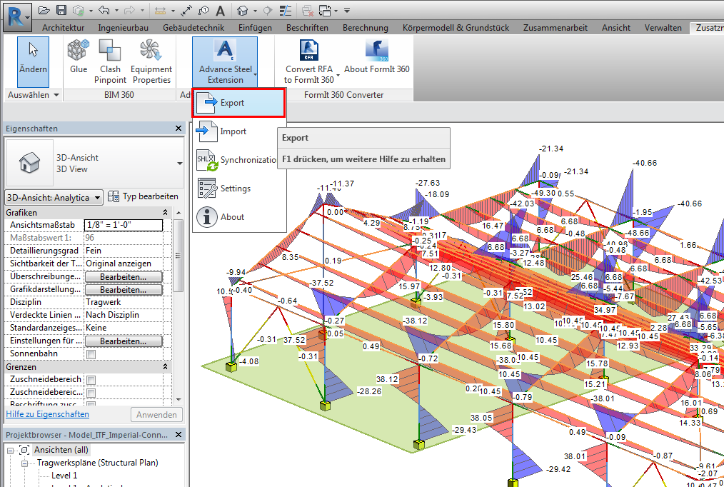 Verwenden Sie zum Übertragen von Analyseergebnissen aus Revit-Projekten in Advance Steel-Modelle die Advance Steel Extension for Revit.