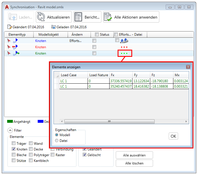 Die Differenzen zwischen der SMLX-Datei und dem Modell für die einzelnen Kraft- oder Momentrichtungen können in einem separaten Dialogfeld angezeigt werden. Dieses Dialogfeld können Sie durch Doppelklicken auf die drei Punkte in der jeweiligen Synchronisierungszeile aufrufen: