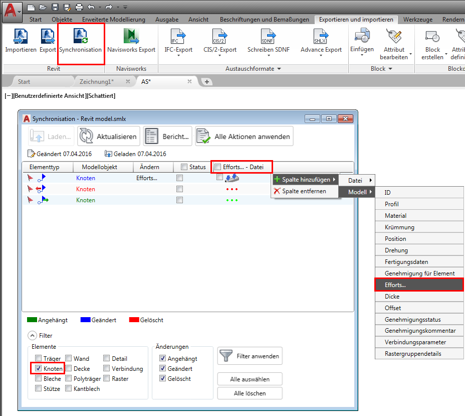 Im Dialogfeld Synchronisierung steht der Filter Knoten zur Verfügung. Bei Verwendung dieses Filters werden nur die Zeilen für den Knoten im Dialogfeld angezeigt. Darüber hinaus können über die SMLX-Datei oder das Modell zwei Spalten aufgerufen werden, in denen die Kraft- und Momentwerte innerhalb eines Knotens angezeigt werden. Die Spalten haben die Bezeichnungen "Efforts…-File" und "Efforts…" und werden durch Rechtsklicken auf die Kopfzeile geöffnet.