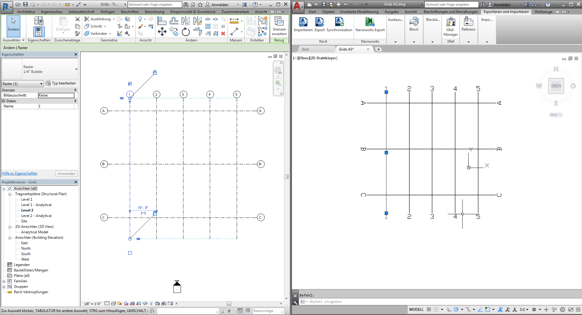 Sie können Raster sowohl in Advance Steel als auch in Revit als einzelne Achsen modellieren. In diesem Fall werden die Raster zwischen den beiden Programmen als einzelne Achsen übertragen.