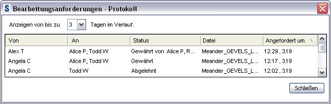 Im Dialogfeld Bearbeitungsanforderungen - Protokoll kann ein bis zu fünf Tage umfassendes Protokoll zu den Bearbeitungsanforderungen angezeigt werden.