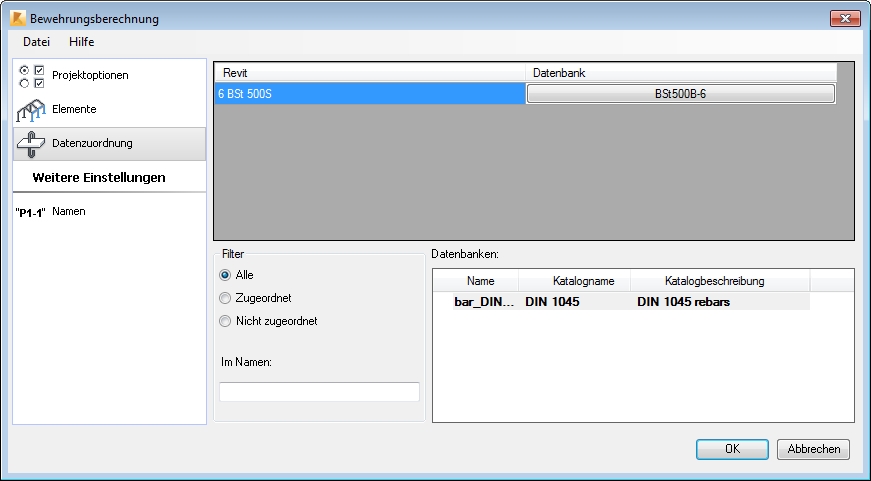 Auf dieser Registerkarte können Sie den Bewehrungsstäben, die Sie aus Revit in Robot exportieren, Stahlklassen und Durchmesser zuweisen. Dies ist wichtig, wenn verschiedene Listen von Bewehrungsstäben in Revit und Robot verwendet werden.