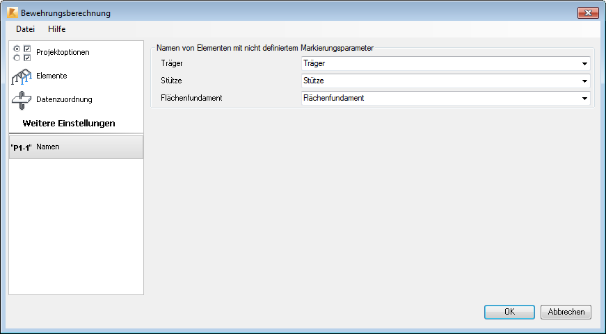 Die Registerkarte Namen ist im Bemessungs- und Überprüfungsmodus verfügbar. Sie gilt nur für Elemente, für die der Parameter Markierung nicht definiert ist. Verwenden Sie sie, um ein Präfix für Robot-Stahlbetonelemente zu definieren.