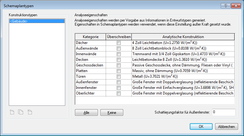 Bei der nächsten Energieanalyse werden die thermischen Eigenschaften der angegebenen Schemaplantypen (analytischen Konstruktionen) für die betreffenden Elementkategorien verwendet.