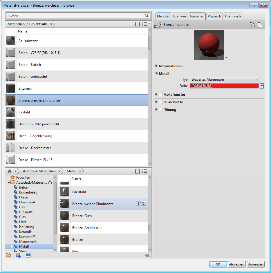 Die folgende Abbildung zeigt einige der Darstellungseigenschaften für das Material Bronze, weiche Zinnbronze, wie es im Material-Browser angezeigt wird.