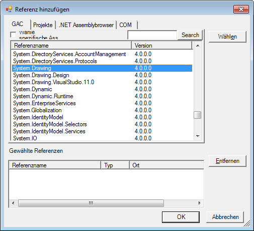 Suchen Sie im Dialogfeld Verweis hinzufügen in der Liste nach System.Drawing und System.Windows.Forms, und wählen Sie diese Einträge aus. Halten Sie für die Mehrfachauswahl die Strg-Taste gedrückt. Beispiel: