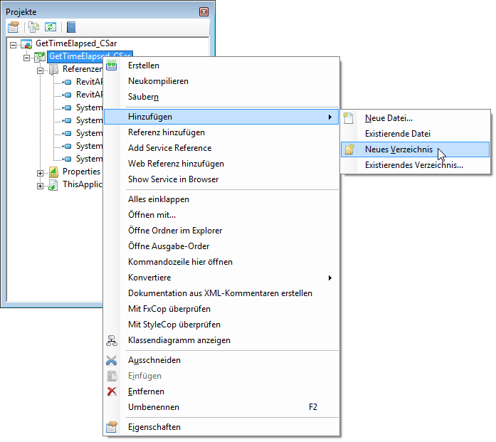 Wechseln Sie wieder zur Revit-IDE. Klicken Sie im Projektexplorer (um dieses Beispiel fortzusetzen) mit der rechten Maustaste auf den Ordner, den Sie für Ihr Makro erstellt haben, und wählen Sie Hinzufügen