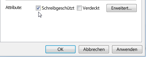 Um eine Materialbibliothek zu sperren, klicken Sie im Fenster von Windows Explorer mit der rechten Maustaste auf die Datei, wählen Sie Eigenschaften, und aktivieren Sie das Attribut Schreibgeschützt.
