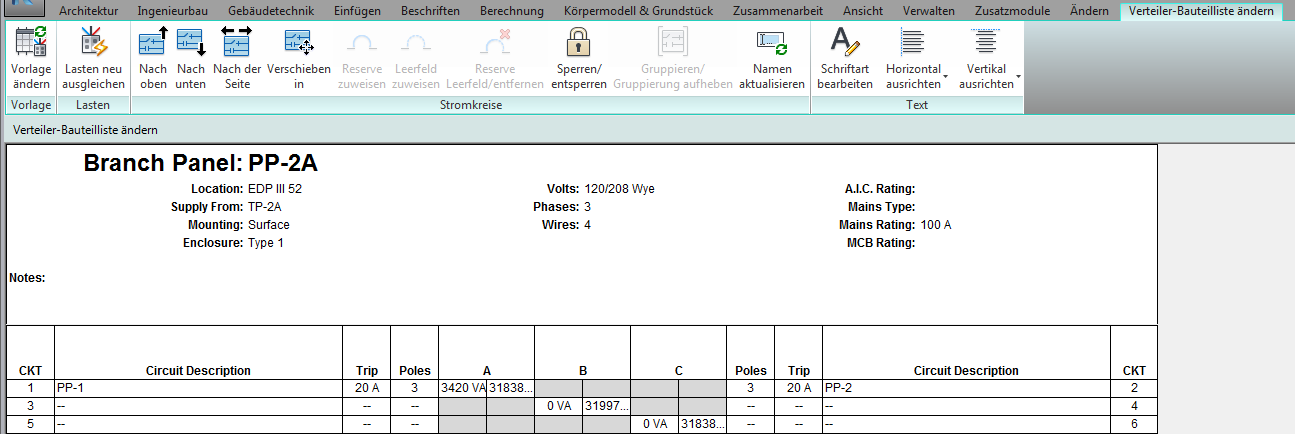 Wenn eine Verteiler-Bauteilliste angezeigt wird, können Sie Stromkreise auf der Schalttafel neu anordnen, indem Sie sie nach oben, unten, links und rechts verschieben oder indem Sie sie gruppieren und an ihren Positionen sperren. Sie können auch die Last über die Phasen hinweg ausgleichen, Reserveklemmen und Leerfelder zuweisen und Stromkreisnamen aktualisieren.