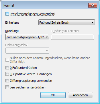 Die Option Projekteinstellungen verwenden ist standardmäßig ausgewählt. Das bedeutet, dass der Wert entsprechend der Einstellung Einheiten im Projekt angezeigt wird.