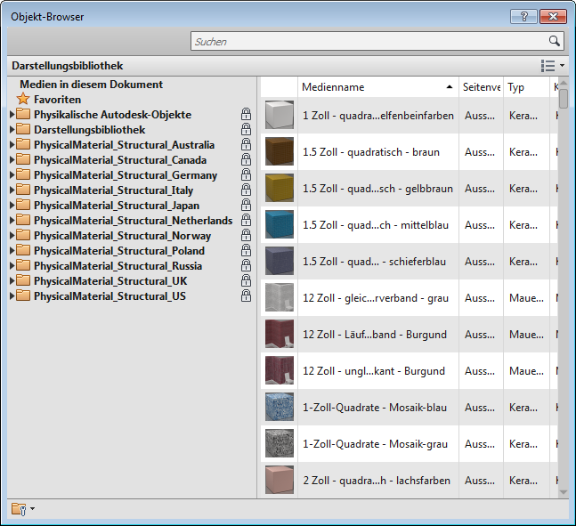 Objekte werden in einem Revit-Projekt oder in einer Bibliothek gespeichert. Objekte, die in einem Revit-Projekt enthalten sind, aber von keinem Material referenziert werden, werden in der Bibliothek Nicht referenzierte Objekte gespeichert. Sie können nicht referenzierte Objekte während einer Revit-Sitzung nach Bedarf erstellen und bearbeiten. Sie müssen jedoch Ihr Revit-Projekt speichern, damit die nicht referenzierten Objekte, die Sie während der Sitzung erstellt oder bearbeitet haben, gespeichert werden.