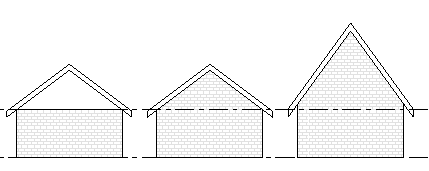 Im folgenden Beispiel zeigt das Bild auf der linken Seite ein Dach, das auf Wänden platziert wurde, deren obere Abhängigkeit als Ebene 2 definiert wurde. Die mittlere Abbildung zeigt die Auswirkung, wenn die Wände mit dem Dach verbunden werden. Das Bild auf der rechten Seite zeigt, wie sich das Wandprofil entsprechend ändert, wenn die Neigung des zugeordneten Dachs geändert wird.